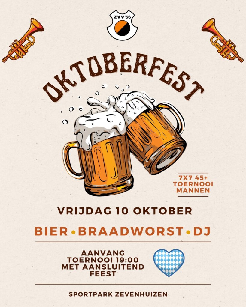 Aansluitend op dit toernooi zal het geluid van Duitse Schlagermuziek uit de boxen knallen, want dan is het weer tijd voor het jaarlijkse Oktoberfest van ZVV’56. Aanvang 20.00 uur. Iedereen vanaf 18 jaar en ouder is welkom.